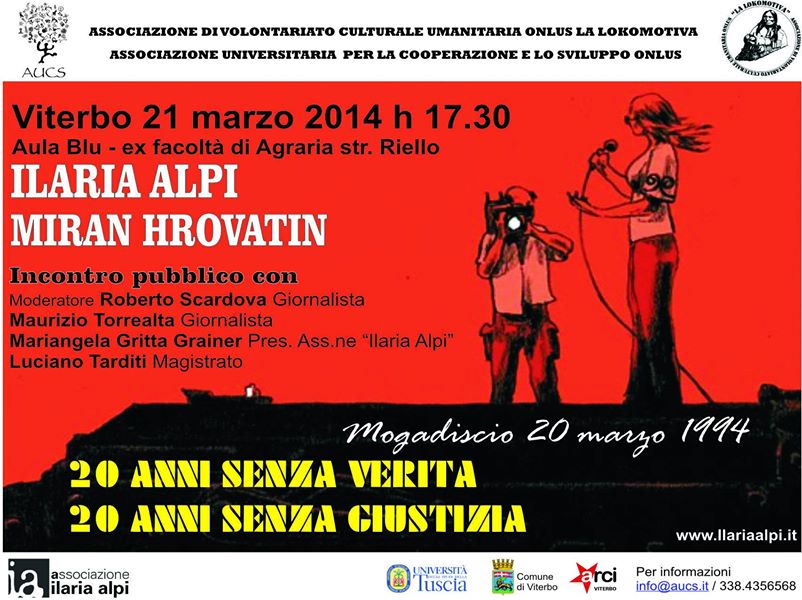 Aucs, in collaborazione con l’Associazione culturale La Lokomotiva di Rieti, intende organizzare un incontro dibattito pubblico in occasione del 20° anniversario della scomparsa Ilaria Alpi e Miran Hrovatin, che cadrà il 20 marzo 2014. Un appuntamento di assoluto rilievo nel panorama nazionale.
