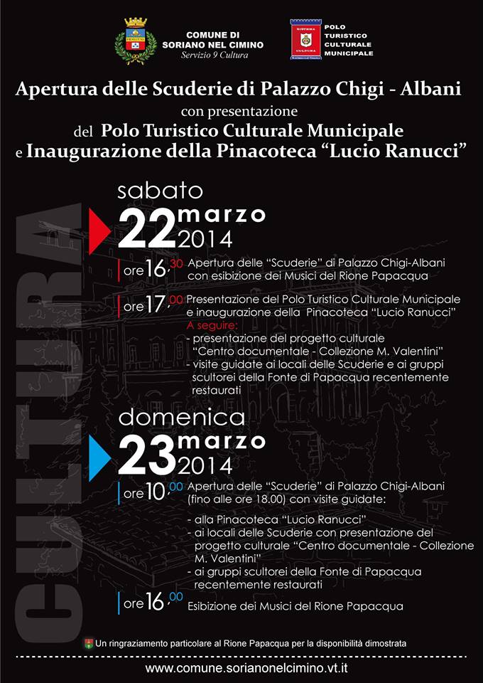 Sabato 22 marzo, a Soriano, apertura delle Scuderie di Palazzo Chigi- Albani con presentazione del Polo Turistico Culturale Municipale e inaugurazione della Pinanoteca “Lucio Ranucci”