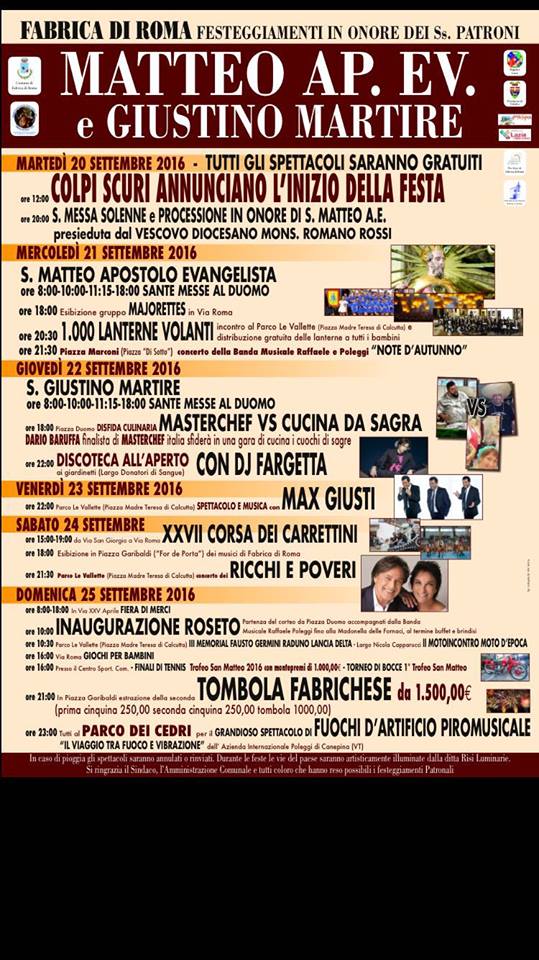 FABRICA DI ROMA – Celebrazioni in grande stile per l’imminente ricorrenza patronale di San Matteo e Giustino a Fabrica di Roma.