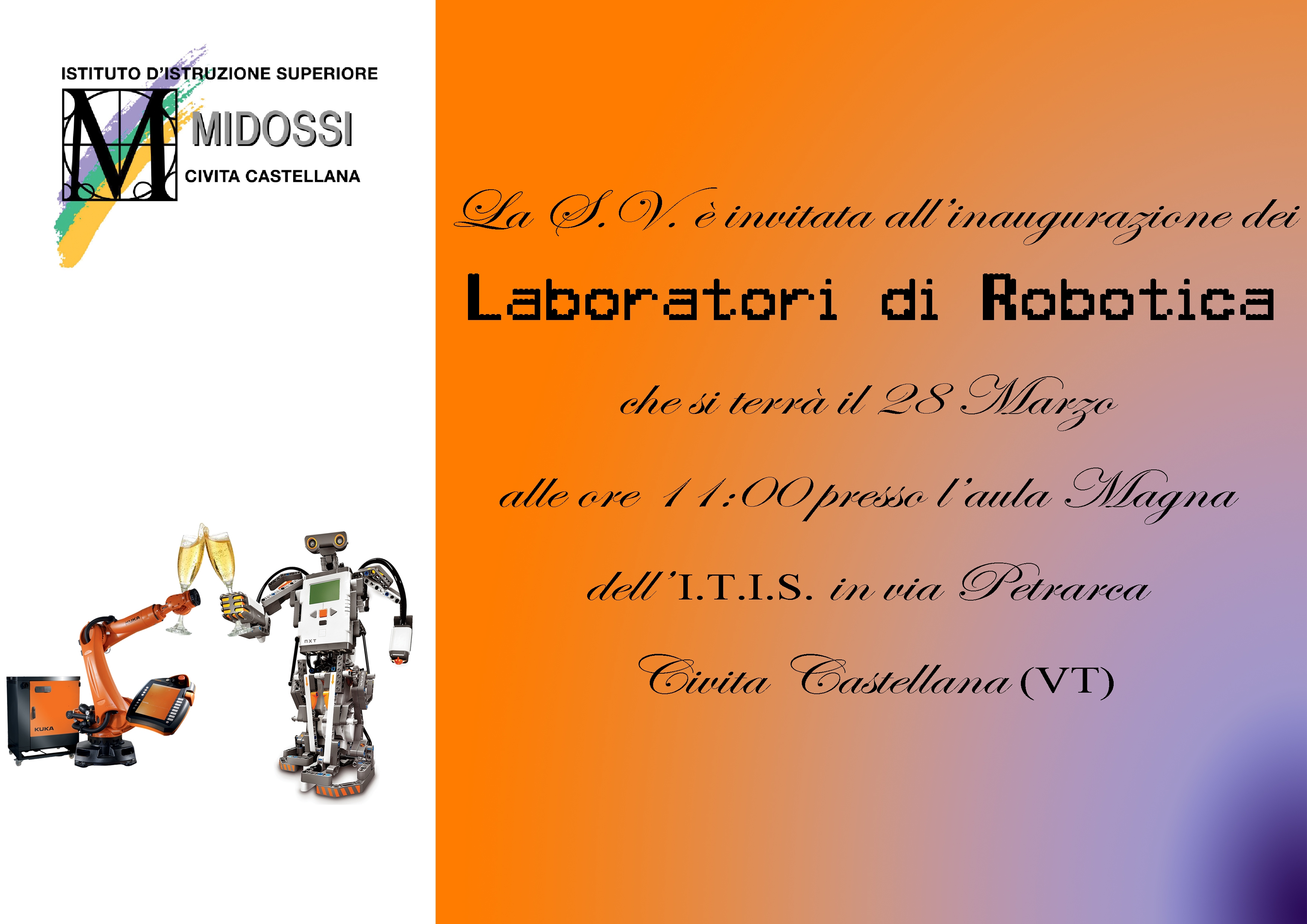 Organizzata dall’ Istituto d’ Istruzione Superiore “Midossi” di Civita Castellana “La Robotica come scelta e formazione professionale” è il tema della cerimonia dedicata all’ inaugurazione dei “Laboratori di Robotica” il 28 marzo prossimo, alle ore 11,00, presso l’ aula Magna dell’ Itis situata in via Petrarca.