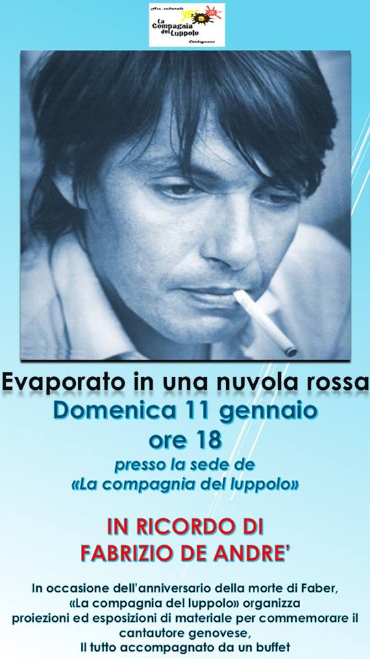 In occasione dell’ anniversario della sua morte dalle ore 18,00 presso la Compagnia del Luppolo si commemorerà il grande Faber attraverso l’esposizione di materiale fotografico, musicale e mediante la proiezione di video riguartdanti il cantautore genovese.