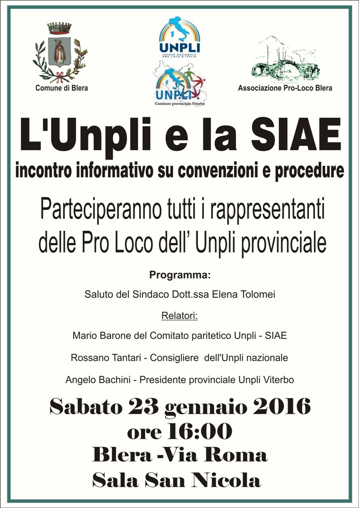 BLERA – Il comitato provinciale Unpli Viterbo si fa promotore di un’importante iniziativa a favore delle Pro Loco della provincia di Viterbo. A Blera il 23 gennaio alle ore 16:00, presso la sala San Nicola è in programma un incontro formativo dal titolo “L’Unpli e la Siae”.