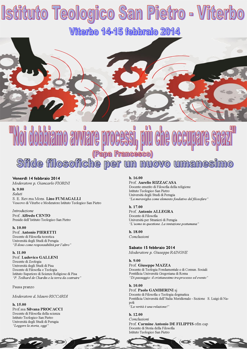 Il 14 e 15 febbraio 2014 si terrà un incontro sulle “Sfide filosofiche per un nuovo umanesimo” presso l’Istituto teologico San Pietro di Viterbo. Inizio dei lavori il 14 alle ore 9 con i saluti del vescovo di Viterbo, mons. Lino Fumagalli e a seguire altri interventi