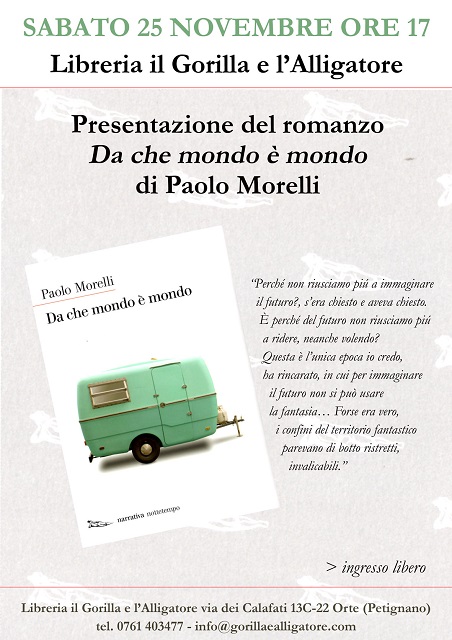 ORTE – Sabato 25 novembre, alle 17, presso la libreria Il Gorilla e l’Alligatore di Orte, Paolo Morelli presenta il suo nuovo libro “Da che mondo è mondo” (nottetempo).