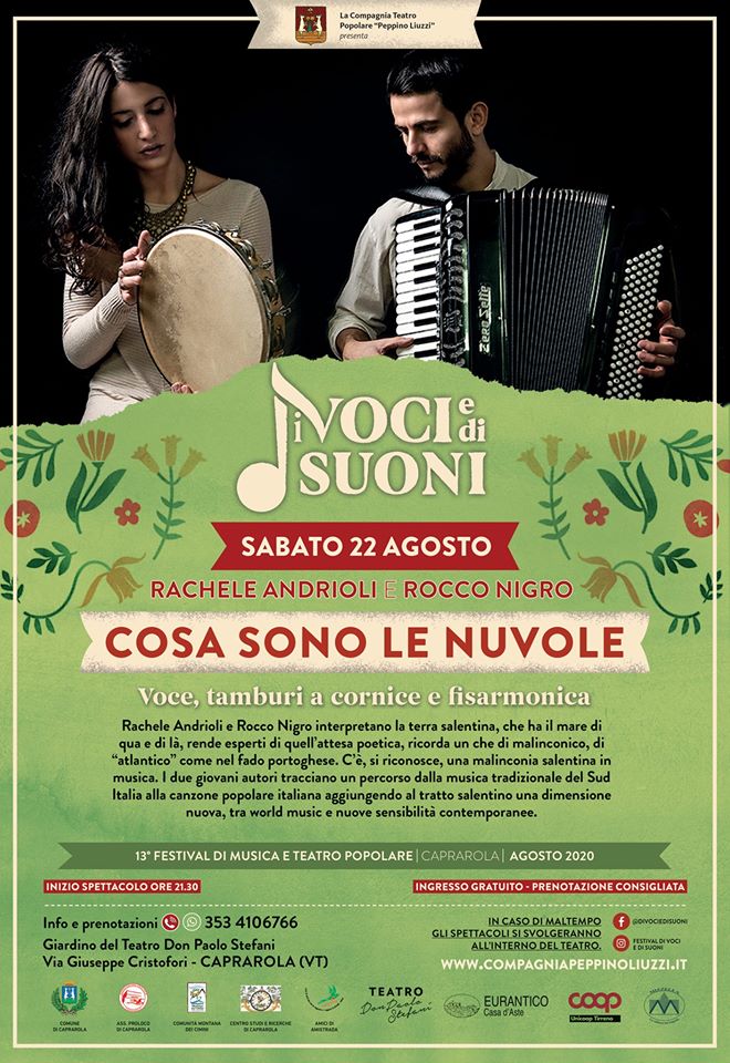 Sabato 22 agosto alle ore 21 ultimo appuntamento con il festival di musica e teatro popolare “Di Voci e di Suoni“, che propone il concerto “Cosa sono le nuvole“. Sul palco Rocco Nigro e Rachele Andrioli (voce, tamburi a cornice e fisarmonica).
