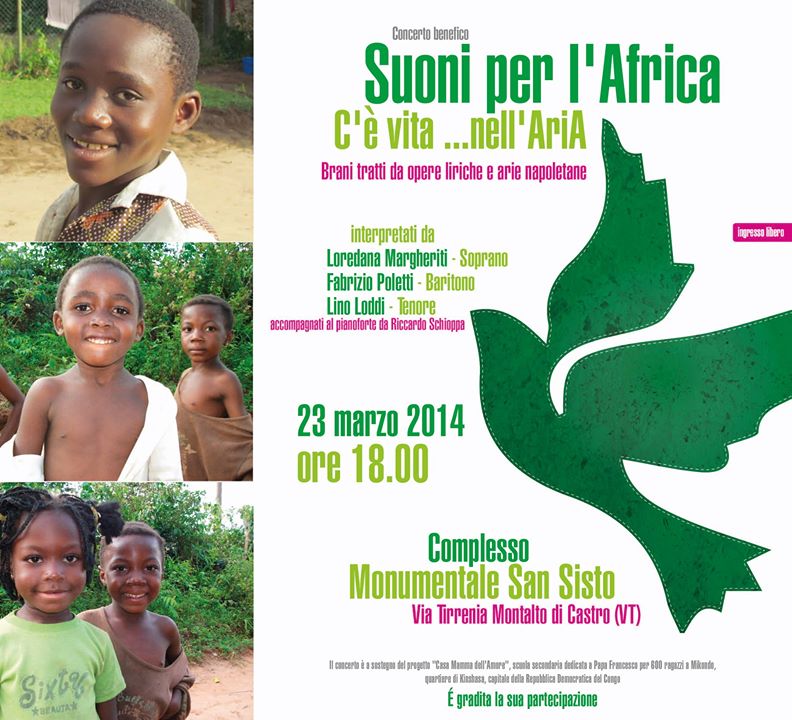 Domenica 23 marzo, alle ore 18.00, nel complesso monumentale San Sisto (via Tirrenia) a Montalto di Castro, andrà in scena “Suoni per l’Africa – C’è vita… nell’AriA”, una raccolta di brani tratti da opere liriche e arie napoletane portate sul palco da Loredana Margheriti, soprano, Fabrizio Poletti, baritono, e Lino Loddi, tenore, accompagnati al pianoforte dal maestro Riccardo Schioppa. Il concerto (ingresso libero), organizzato dall’associazione Semi di Pace International e dal Comune di Montalto di Castro, con il patrocinio della Regione Lazio, della Provincia di Viterbo e della Diocesi di Civitavecchia – Tarquinia, è a sostegno del progetto “Casa mamma dell’amore”, la costruzione di una scuola secondaria dedicata a Papa Francesco per 600 ragazzi/e a Mikondo, quartiere di Kinshasa, capitale della Repubblica Democratica del Congo. La manifestazione rientra nell’ambito dell’ottava edizione dell’iniziativa di solidarietà “Una colomba per un sorriso”. «La scuola a Kinshasa è una delle priorità dell’associazione in campo internazionale. – dichiara Semi di Pace International – Vogliamo dare un futuro migliore a tantissimi giovani, garantendo il diritto all’istruzione. Il nostro impegno inizia a dare suoi risultati. Alla fine di febbraio, infatti, è stata posta la prima pietra ed è stato dato il via ai lavori»