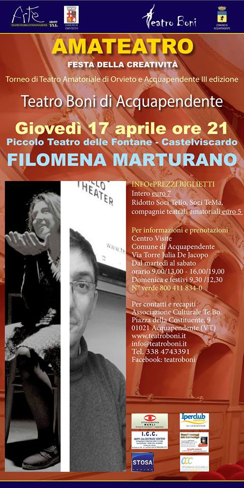ACQUAPENDENTE – Giovedì 17 aprile, ad Acquapendente, per “AMATEATRO” va in scena Filomena Marturano, liberamente tratto dal testo di Eduardo De Filippo con Nadia Tiezzi, Domenico Cafasso, Silvia Araceli, Valentino Valentini