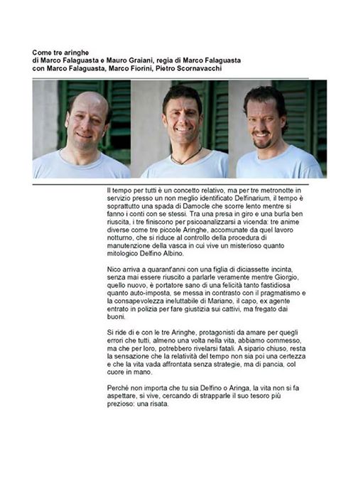 Il tempo per tutti è un concetto relativo, ma per tre metronotte in servizio presso un non meglio identificato Delfinarium, il tempo è soprattutto una spada di Damocle che scorre lento mentre si fanno i conti con se stessi. Tra una presa in giro e una burla ben riuscita, i tre finiscono per psicoanalizzarsi a vicenda: tre anime diverse come tre piccole Aringhe, accomunate da quel lavoro notturno, che si riduce al controllo della procedura di manutenzione della vasca in cui vive un misterioso quanto mitologico Delfino Albino.
