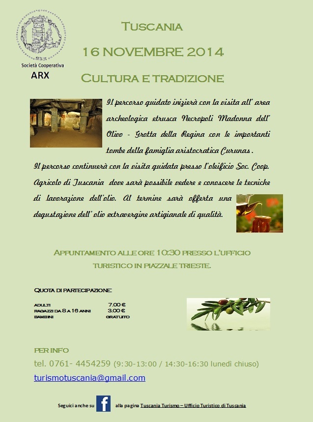 TUSCANIA – Domenica 16 novembre, a Tuscania, Cultura e Tradizione: Il percorso guidato inizierà con la visita all’ area archeologica etrusca Necropoli Madonna dell’ Olivo – Grotta della Regina con le importanti tombe della famiglia aristocratica Curunas .