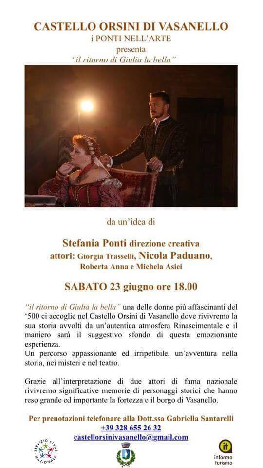 VASANELLO – Sabato 23 giugno, al Castello di Vasanello, il ritorno di Giulia “La Bella”, visita guidata teatralizzata da un’idea di Stefania Ponti direzione creativa