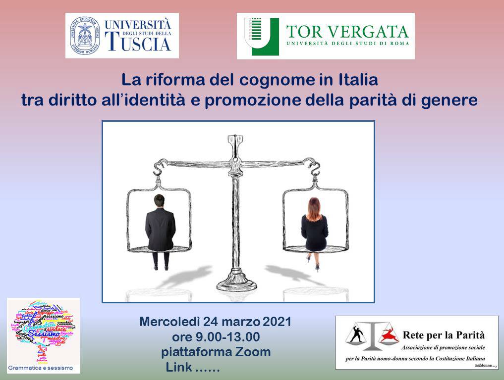 L’Università degli Studi della Tuscia, l’Università di Roma “Tor Vergata” insieme al gruppo di ricerca Grammatica e Sessismo – Centro di ricerca multidisciplinare e Rete per la Parità, propongono un incontro online dal titolo “La riforma del cognome in Italia tra diritto all’identità e promozione della parità di genere”.
